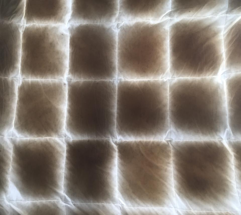 悄咪咪地对光端详,可以看到鹅绒在每个方格中熨帖地铺展着,没有任何堆积过厚或缺绒的地方,簇簇朵绒纤巧细密,每一个的缝合处都是向内收线,浑然一体很像自然拼合,倒像是件艺术品了。
