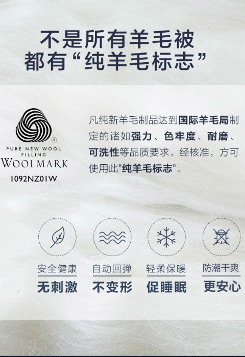 拥有WOOLMARK纯羊毛标志的羊毛产品不含再生毛,再生毛指的是由羊毛纺织品的废料处理所得的羊毛,此类羊毛长短参差不齐、粗细不均、纤维强度低,会严重影响羊毛纺织品质量。